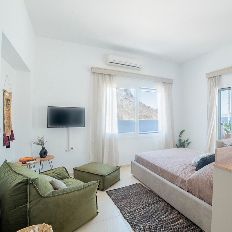 Take in the stunning scenery from your spacious terrace, where the Aegean Sea meets the majestic mountains. Start your day with a fresh cup of coffee while soaking up the morning light, or wind down in the evening with a glass of wine as the sun sets in a palette of vibrant colors.