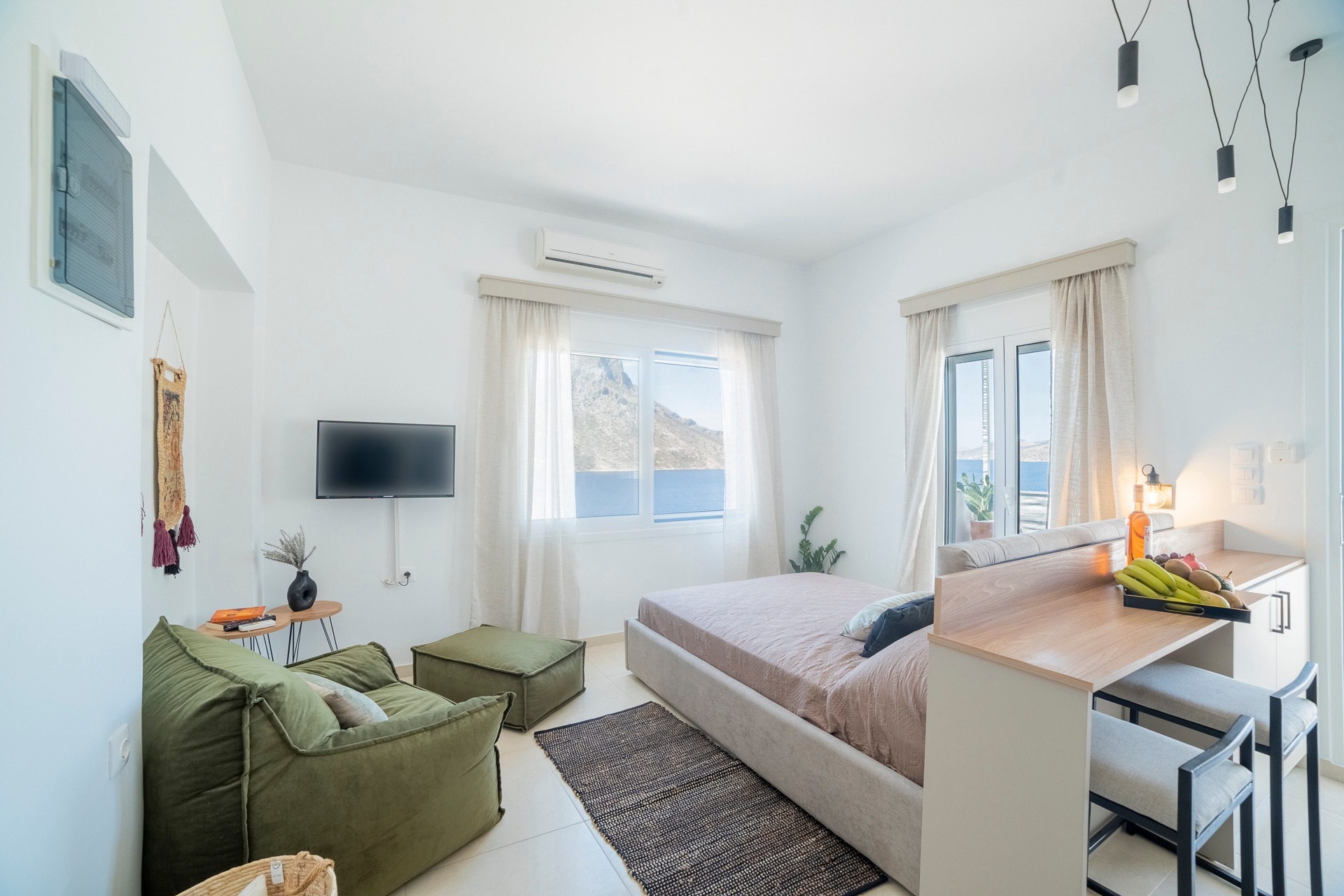 Enjoy stunning sea views from the balcony, comfort with air conditioning, and free Wi-Fi. Fully equipped kitchen and washing machine for added convenience. Ideally located near the island’s famous climbing routes, offering a relaxing base for your adventures!